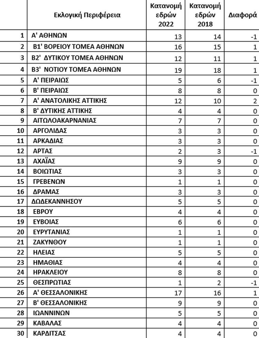 Ακολουθεί ο πίνακας με την κατανομή των εδρών που διαμορφώνει τον νέο εκλογικό χάρτη της χώρας για την επόμενη εκλογική διαδικασία.