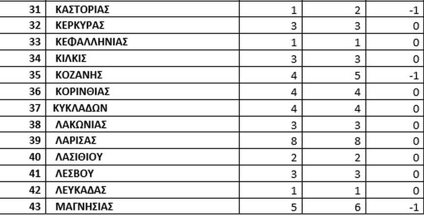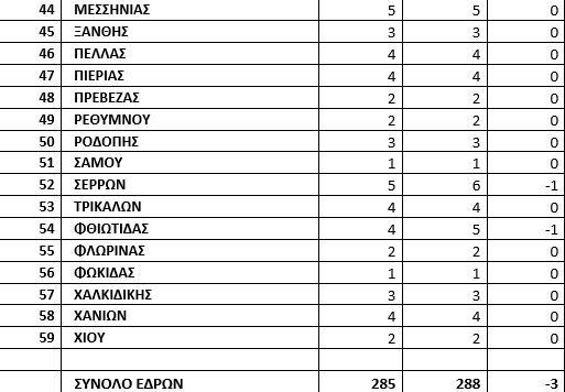 Αντίθετα, από μία έδρα χάνουν οι εκλογικές Περιφέρειες Α΄ Αθηνών, Α΄ Πειραιώς, Άρτας, Κοζάνης, Μαγνησίας, Σερρών, Φθιώτιδας, Θεσπρωτίας και Καστοριάς. Μάλιστα οι δύο τελευταίες Περιφέρειες καθίστανται μονοεδρικές.