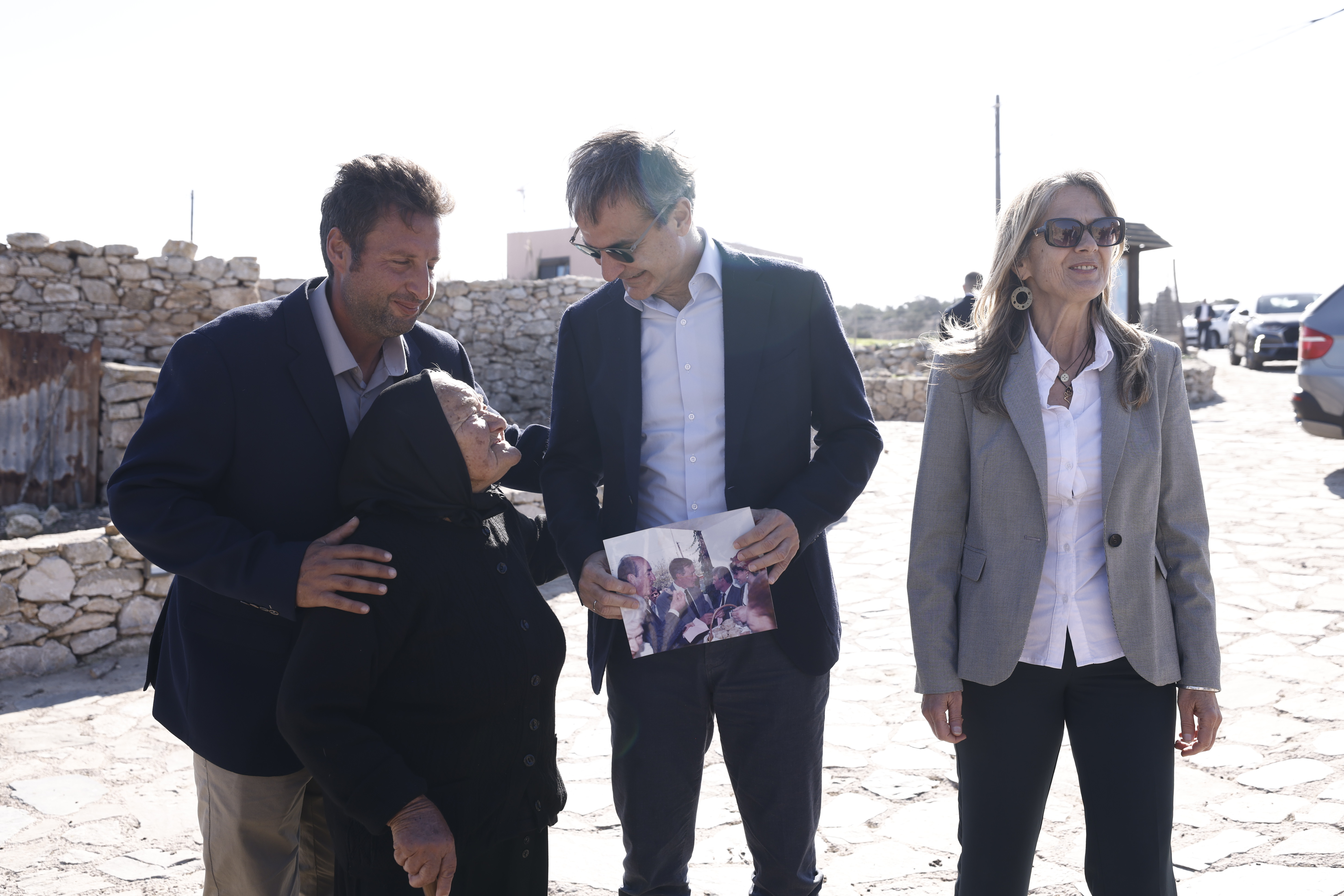 Τελευταίος σταθμός της επίσκεψης του Πρωθυπουργού ήταν το χωριό Άμπελος, όπου είχε την ευκαιρία να συναντήσει, να ανταλλάξει ευχές και να συζητήσει με την κυρία Χριστίνη, μία εκ των γηραιότερων μόνιμων κατοίκων του νησιού.