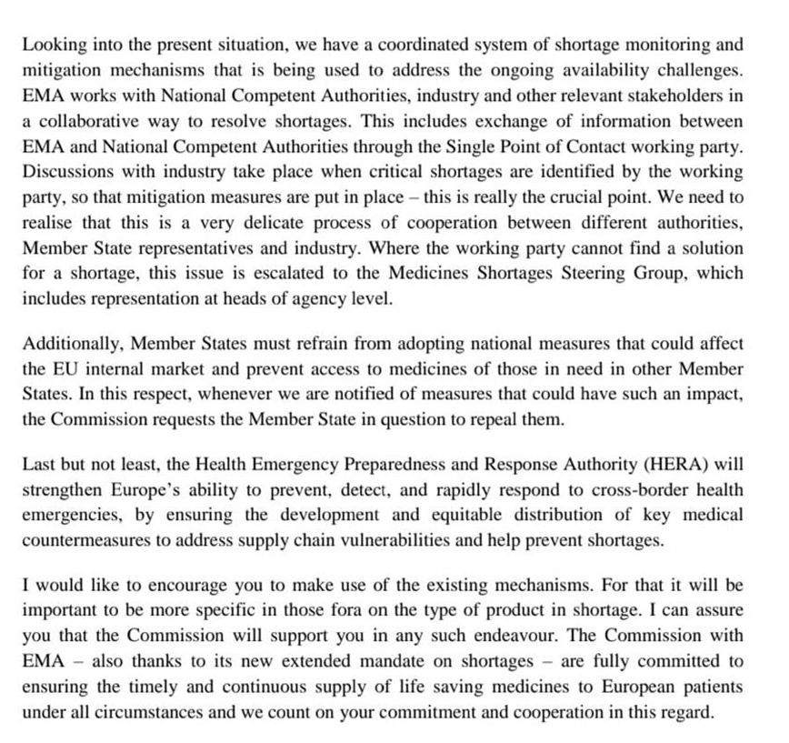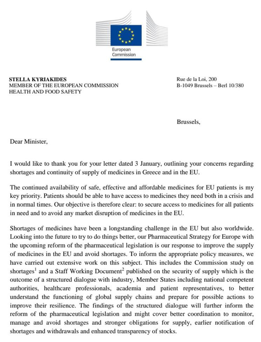 Θα ήθελα να σας ευχαριστήσω για την επιστολή σας με ημερομηνία 3 Ιανουαρίου, στην οποία περιγράφετε τις ανησυχίες σας σχετικά με τις ελλείψεις και τη συνέχεια της προσφοράς φαρμάκων στην Ελλάδα και στην ΕΕ.