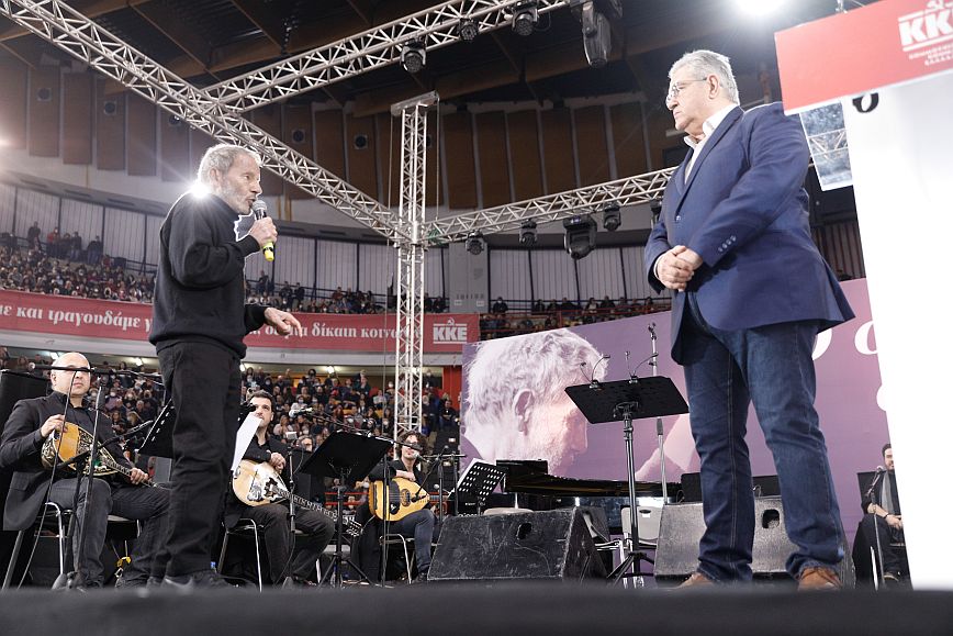 «Ιστορική βραδιά γιατί ποτέ στα πολιτισμικά δρώμενα αυτής της χώρας δεν συνέβη αυτό το γεγονός που συμβαίνει απόψε εδώ. Ακόμα και το ΚΚΕ ξεπέρασε τον χαρακτηρισμό της προόδου και μπήκε στη σφαίρα της υπέρβασης. Μια υπέρβαση που χρειάζεται κότσια για να την κάνεις. Και το μόνο κόμμα που έχει κότσια όχι μόνο να την κάνει αλλά και να την υλοποιήσει είναι το Κομμουνιστικό Κόμμα Ελλάδας», είπε χαρακτηριστικά ο συνθέτης καταχειροκροτούμενος από χιλιάδες κόσμου.