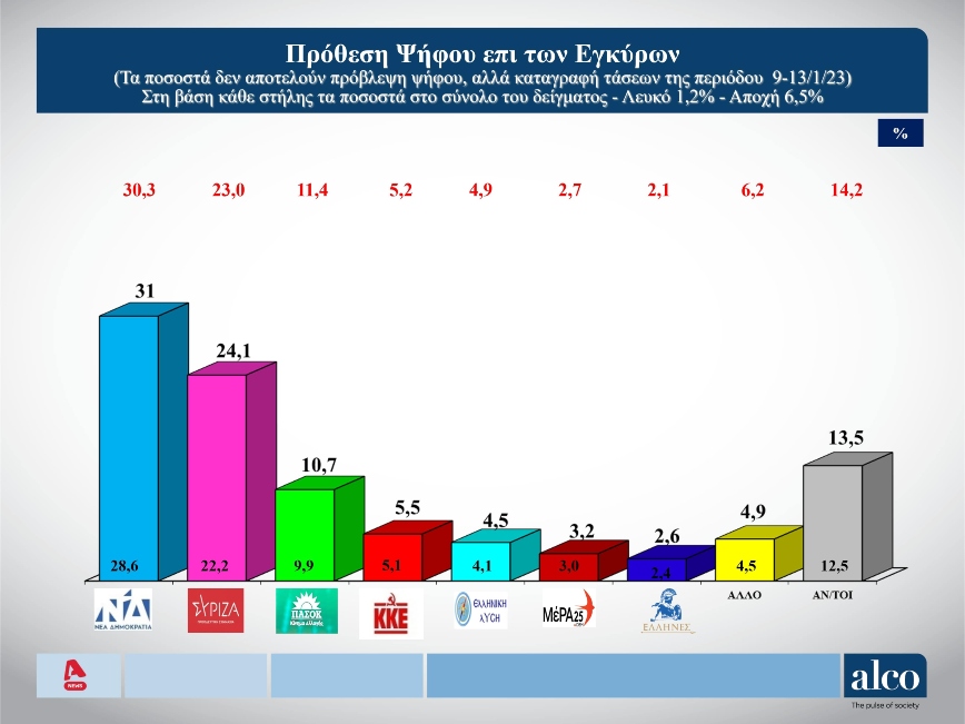 Η εταιρεία Alco πραγματοποίησε την πρώτη δημοσκόπηση του 2023 για τον Alpha με τη διαφορά της Νέας Δημοκρατίας με τον ΣΥΡΙΖΑ να βρίσκεται στις 6,9 μονάδες. Οι πολίτες απάντησαν για το κριτήριο με το οποίο θα ψηφίσουν, αλλά και για τα προβλήματα της καθημερινότητας.