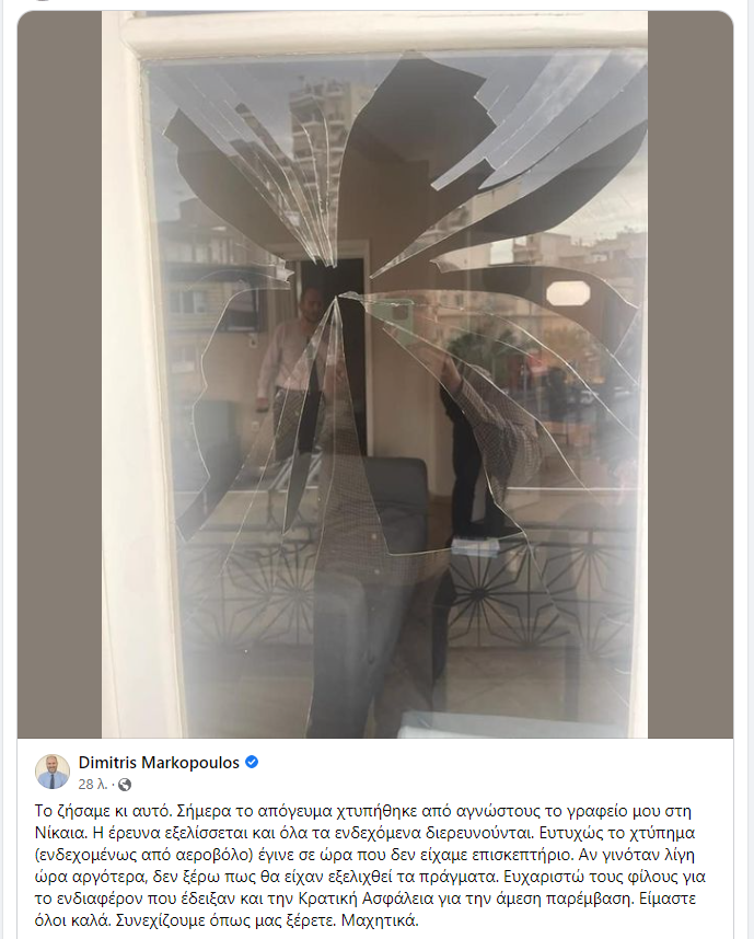 «Το ζήσαμε κι αυτό. Σήμερα το απόγευμα χτυπήθηκε από αγνώστους το γραφείο μου στη Νίκαια. Η έρευνα εξελίσσεται και όλα τα ενδεχόμενα διερευνούνται. Ευτυχώς το χτύπημα (ενδεχομένως από αεροβόλο) έγινε σε ώρα που δεν είχαμε επισκεπτήριο. Αν γινόταν λίγη ώρα αργότερα, δεν ξέρω πως θα είχαν εξελιχθεί τα πράγματα. Ευχαριστώ τους φίλους για το ενδιαφέρον που έδειξαν και την Κρατική Ασφάλεια για την άμεση παρέμβαση. Είμαστε όλοι καλά. Συνεχίζουμε όπως μας ξέρετε. Μαχητικά».