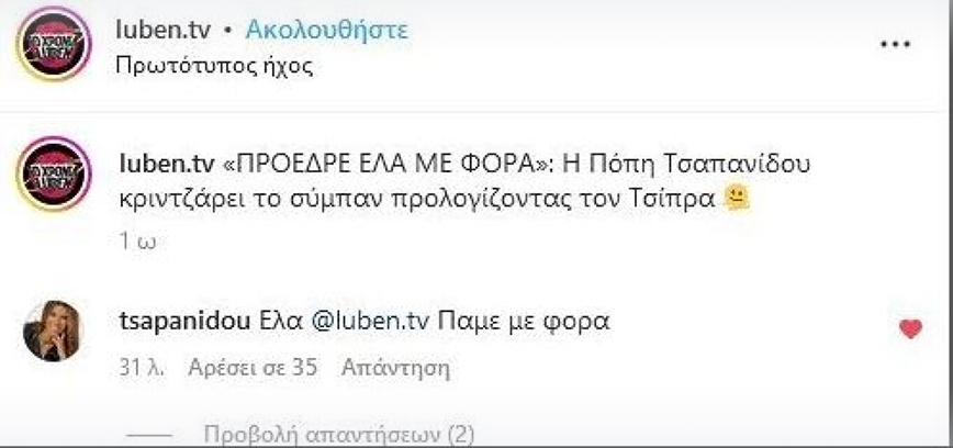 Η Πόπη Τσαπανίδου μέσω των social media απάντησε στο Luben TV για την ατάκα που ανέφερε προς τον Αλέξη Τσίπρα, όταν ο δεύτερος ήταν να ανέβει στο βήμα σε ομιλία που έδωσε στη Θεσσαλονίκη.