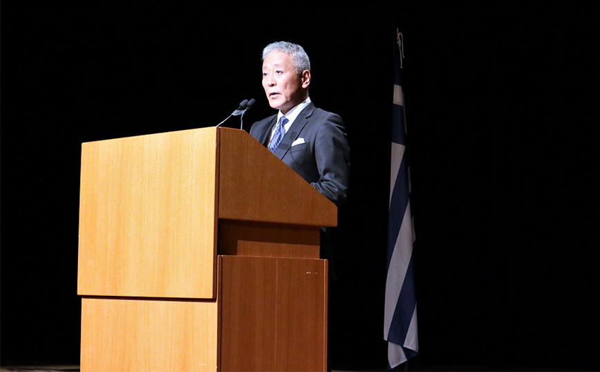 Σε χαιρετισμό του, ο Ιάπωνας πρέσβης εξήρε το άριστο επίπεδο των σχέσεων μεταξύ της Ιαπωνίας και της Ελλάδας και την «πολύ θετική δυναμική» τους, ενώ εξέφρασε τη δέσμευσή του πως είναι αποφασισμένος να κάνει τη μέγιστη δυνατή προσπάθεια για την περαιτέρω προώθησή τους. Αποτυπώνοντας ανάγλυφα το σημερινό επίπεδο των διμερών σχέσεων, εξέφρασε την πεποίθηση ότι σε καμία περίοδο στην ιστορία των δύο χωρών, από το 1899, δεν καταγράφηκαν τόσο ραγδαίες εξελίξεις όσο τους τελευταίους 12 μήνες του 2022, ξεκινώντας με τη συνάντηση των υπουργών Εξωτερικών Νίκου Δένδια και Γιοσιμάσα Χαγιάσι τον Απρίλιο στο Τόκιο. «Οι δύο υπουργοί, αναγνωρίζοντας ότι και οι δύο χώρες μοιράζονται θεμελιώδεις αξίες, όπως η δημοκρατία, τα ανθρώπινα δικαιώματα και το κράτος δικαίου, συμπεριλαμβανομένης της ελεύθερης και ανοικτής θαλάσσιας τάξης, συζήτησαν όχι μόνο τις διμερείς σχέσεις αλλά και διάφορα διεθνή ζητήματα, συμπεριλαμβανομένης της κατάστασης στην Ουκρανία».