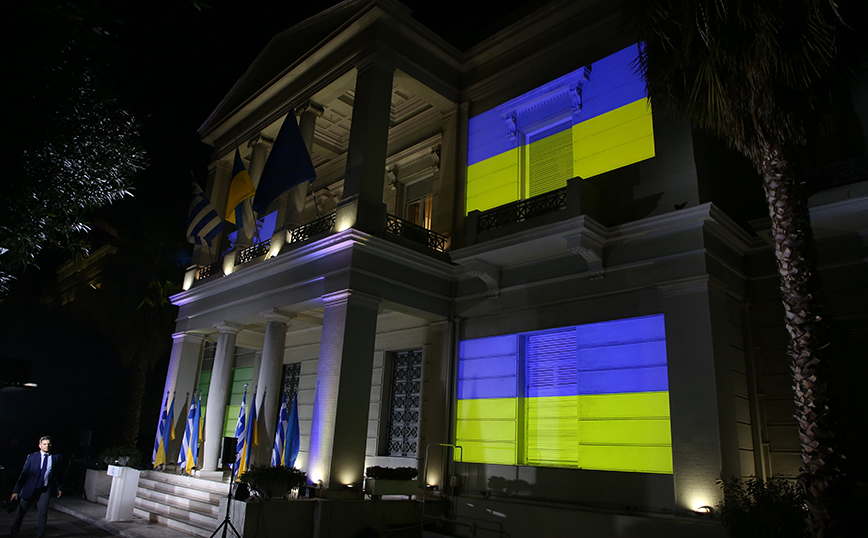 Με τη φωταγώγηση της πρόσοψης του νεοκλασικού κτιρίου του υπουργείου Εξωτερικών από τον υπουργό Εξωτερικών Νίκο Δένδια με τα χρώματα της ουκρανικής σημαίας, την ανάκρουση πένθιμου εμβατηρίου, την τήρηση ενός λεπτού σιγής για τα θύματα του πολέμου και την ανάκρουση των εθνικών ύμνων της Ελλάδας και της Ουκρανίας, ξεκίνησε αργά το απόγευμα η συμβολική τελετή σε ένδειξη συμπαράστασης της χώρας μας στην Ουκρανία, με αφορμή τη συμπλήρωση ενός έτους από την έναρξη της ρωσικής εισβολής.