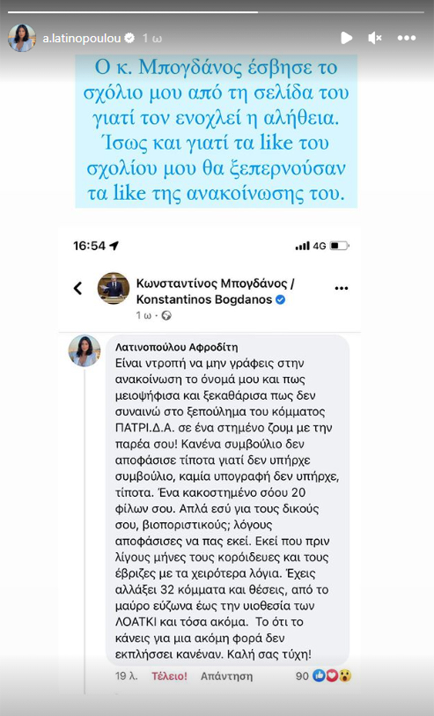 Έτσι, η πολιτευτής σε story που έκανε στο Instagram, σημείωσε ότι διαφωνεί με την παραπάνω απόφαση και εκτόξευσε τα πυρά της κατά του Κωνσταντίνου Μπογδάνου, αναφέροντας ότι εκείνος «πάει εκεί που βρίζει» και πως «έχει αλλάξει 32 κόμματα και θέσεις».
