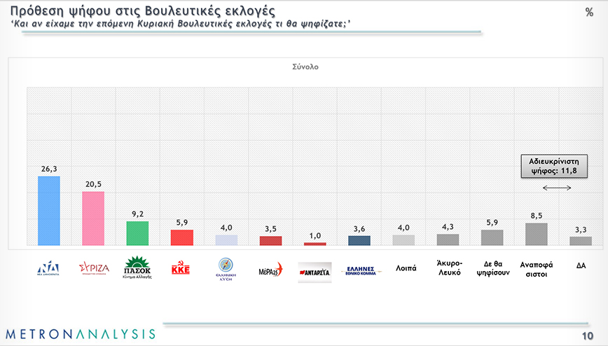 Στην πρόθεση ψήφου η ΝΔ συγκεντρώνει 26,3%, ο ΣΥΡΙΖΑ 20,5%, το ΠΑΣΟΚ 9,2%, το ΚΚΕ 5,9%, η Ελληνική Λύση 4%, ΜέΡΑ 25 3,5%, ΑΝΤΑΡΣΥΑ 1%, Έλληνες 3,6%, άλλα κόμματα 4%, άκυρο-λευκό 4,3%, δεν θα ψηφίσω 5,9%, αναποφάσιστοι 8,5%, ΔΑ 3,3%.