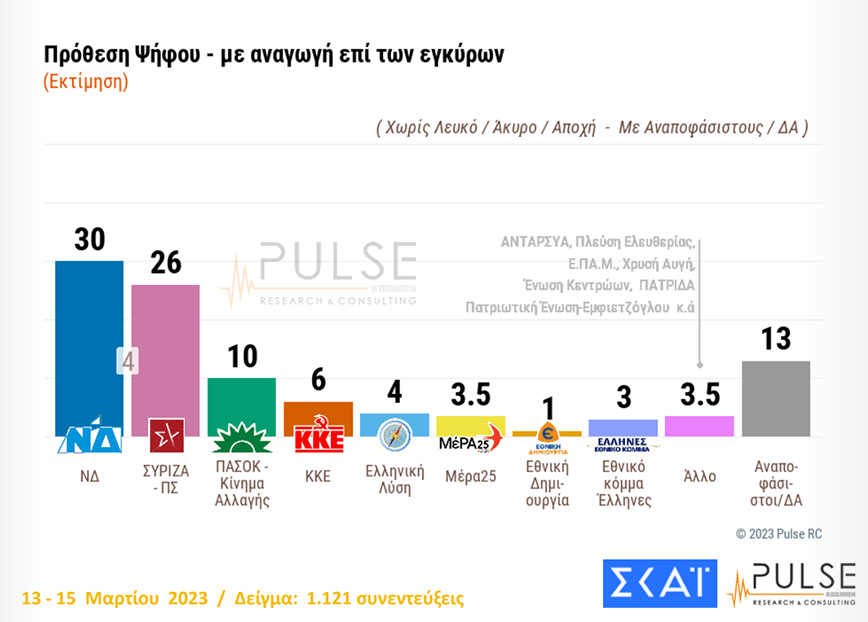 Στη δημοσκόπηση της Pulse για τον ΣΚΑΪ η διαφορά της Νέας Δημοκρατίας με τον ΣΥΡΙΖΑ βρίσκεται στις 4% ενώ 5 στους 10 Έλληνες πιστεύουν πως για την κατάσταση στα τρένα ευθύνονται διαχρονικά οι κυβερνήσεις της Ελλάδας.