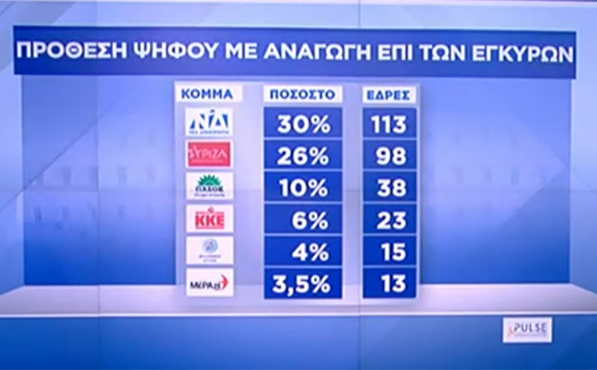 Στην πρόθεση ψήφου της έρευνας της Pulse που πραγματοποιήθηκε μεταξύ 13 – 15 Μαρτίου, σε δείγμα 1.121 ψηφοφόρων η Νέα Δημοκρατία συγκεντρώνει 30%, ο ΣΥΡΙΖΑ 26%, το ΠΑΣΟΚ 10%, το ΚΚΕ 6%, η Ελληνική Λύση 4%, το ΜέΡΑ 25 3,5%, η Εθνική Δημιουργία 1%, οι Έλληνες 3%, άλλο κόμμα 3,5%, 13% αναποφάσιστοι.