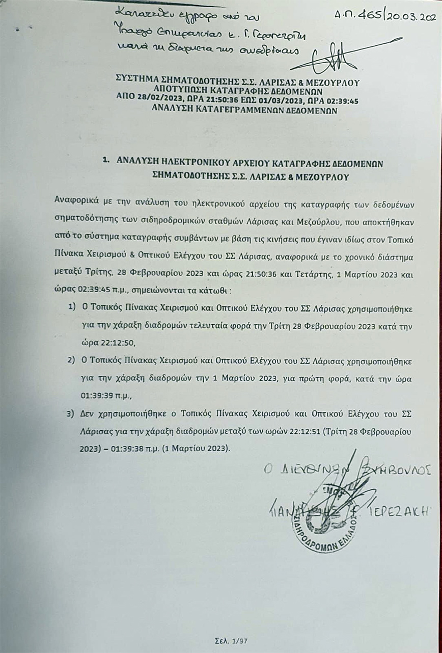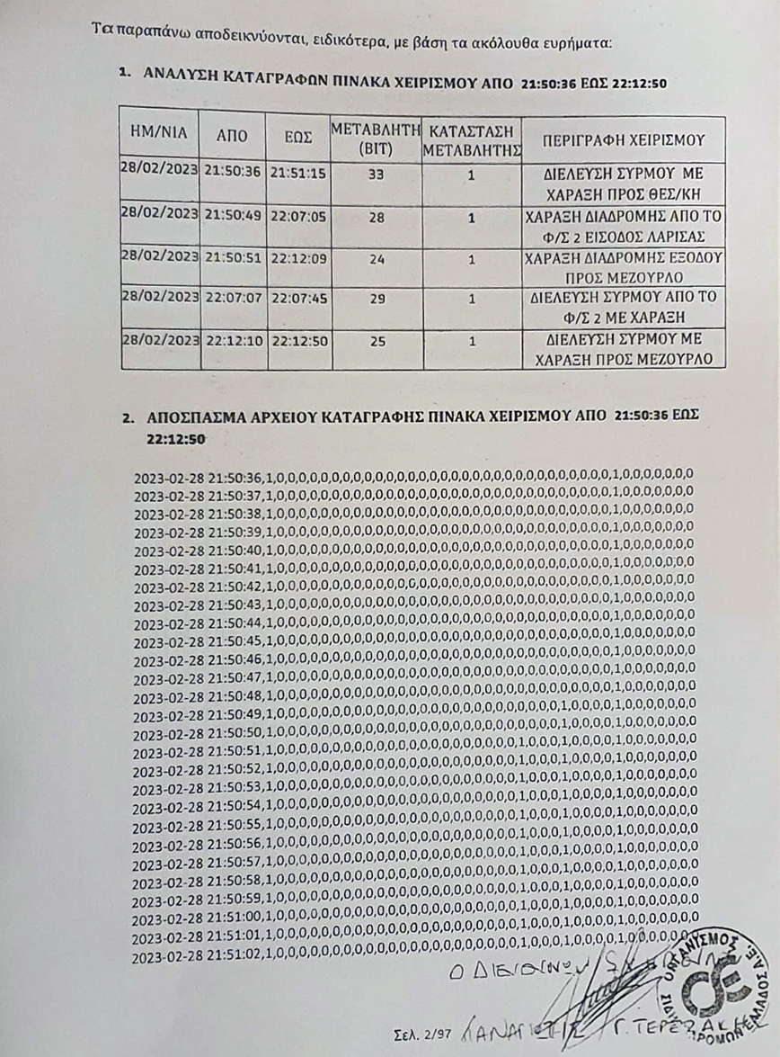 Όπως θα δείτε στο έγγραφο αποδεικνύεται ότι όλα τα δρομολόγια έγιναν με αυτόματη χάραξη εκείνη τη μέρα έως τις 22:12 πριν αναλάβει ο συγκεκριμένος Σταθμάρχης και προκαλέσει το δυστύχημα. Επιπλέον, υπήρξε και δοκιμαστικό δρομολόγιο που έγινε στη 1 τα ξημερώματα με αυτόματη χάραξη. Δηλαδή, μετά το δυστύχημα.