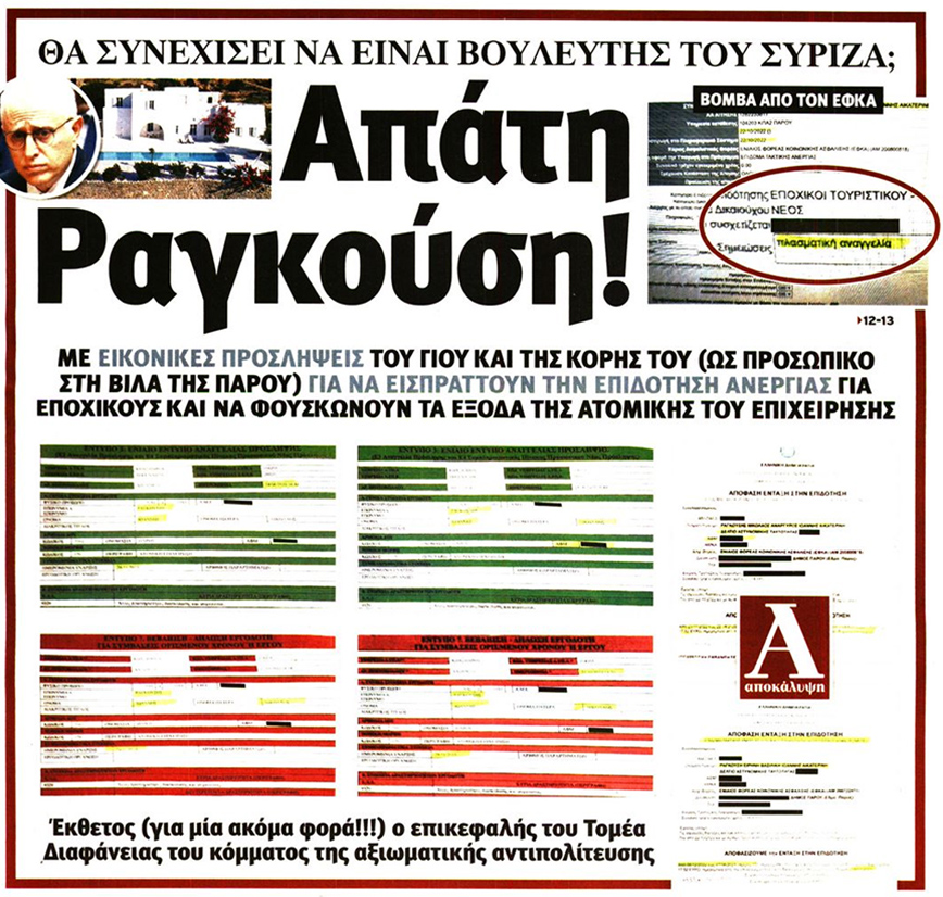 Όπως υποστηρίζει, «αποκορύφωμα της δολιότητάς τους είναι ότι καταφεύγουν σε παραποίηση και πλαστογράφηση του νοήματος εγγράφων ως εξής: Στην 1η και στην 12 σελίδα της εφημερίδας Απογευματινή, εμφανίζουν έγγραφο του ΟΑΕΔ (δεν είναι του ΕΦΚΑ) που έχει υπογραμμισμένο τον όρο “πλασματική αναγγελία”, θέλοντας να δημιουργήσουν την ψευδή εντύπωση ότι αυτό παραπέμπει σε εμένα, σε πλαστή πρόσληψη των παιδιών μου, επομένως και σε δήθεν “απάτη” που ψευδώς ισχυρίζονται στον τίτλο τους, πως έχω διαπράξει».