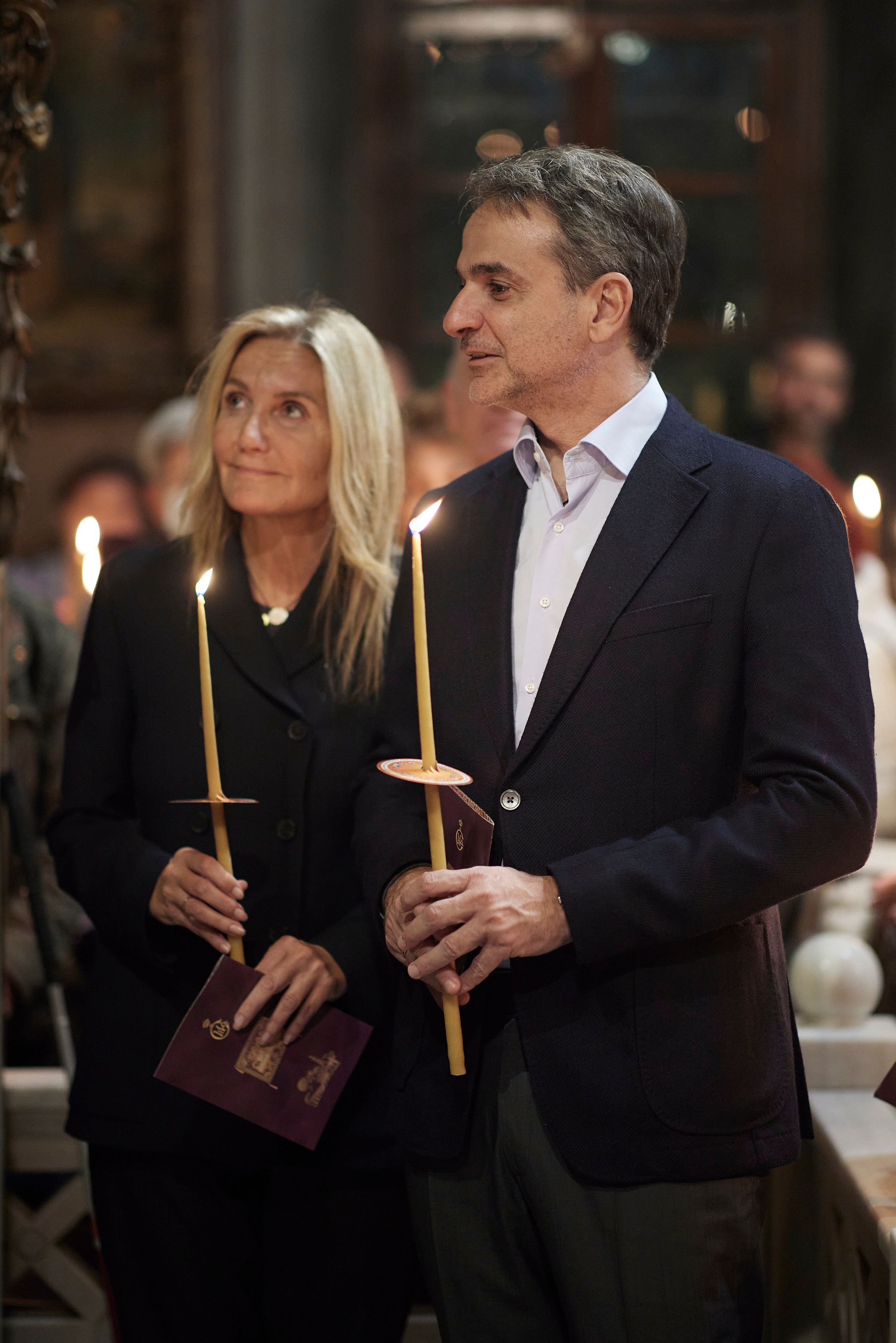 Ο πρωθυπουργός έφτασε στην εκκλησία λίγο μετά τις 9 το βράδυ και άναψε ένα κερί συνοδευόμενος από την σύζυγό του Μαρέβα Γκραμπόφσκι.