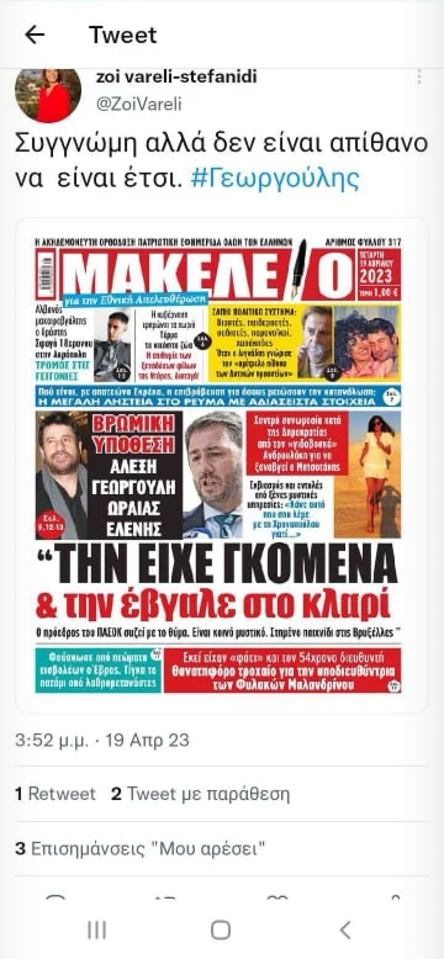 Η μητέρα της Κατερίνας Στεφανίδη λίγη ώρα μετά τη διαγραφή ανάρτησης που έκανε στα social media, όπου αναπαρήγαγε χυδαίο δημοσίευμα κατά της Έλενας Χρονοπούλου που κατήγγειλε τον Αλέξη Γεωργούλη, ζήτησε συγγνώμη.