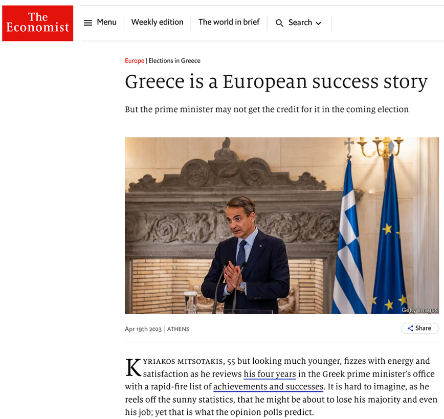 «Η Ελλάδα είναι μια ευρωπαϊκή ιστορία επιτυχίας» είναι ο τίτλος δημοσιεύματος του Economist, σύμφωνα με το οποίο πάντως, «πρωθυπουργός μπορεί να μη λάβει τα εύσημα γι’ αυτό στις επερχόμενες εκλογές».