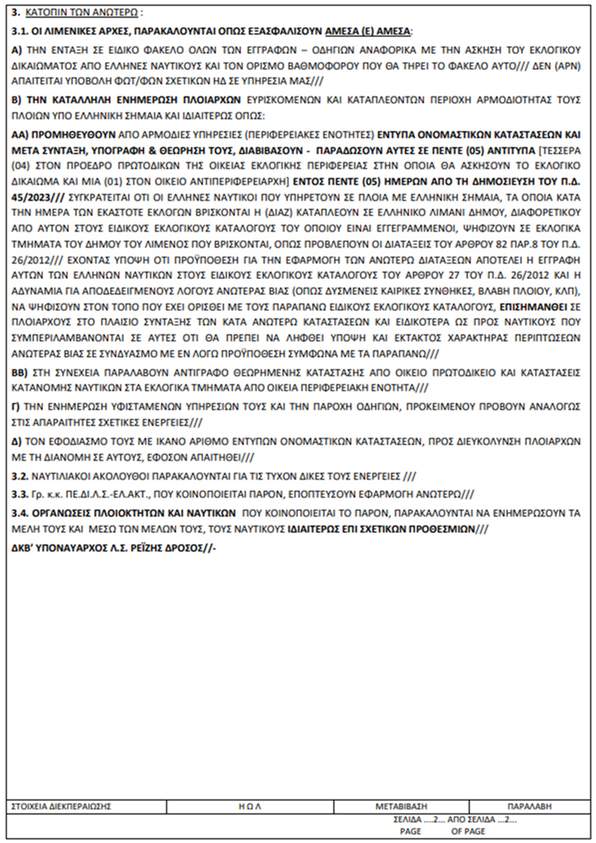 «Oι Έλληνες ναυτικοί που υπηρετούν σε πλοία με ελληνική σημαία τα οποία κατά την ημέρα των εκάστοτε εκλογών βρίσκονται ή καταπλέουν σε ελληνικό λιμάνι δήμου διαφορετικού από αυτόν στους ειδικούς εκλογικούς καταλόγους του οποίου είναι εγγεγραμμένοι, ψηφίζουν σε εκλογικά τμήματα του δήμου του λιμένος που βρίσκονται, όπως προβλέπουν οι διατάξεις του άρθρου 82 παρ.8 του Π.Δ. 26/2012, έχοντας υπόψη ότι προϋπόθεση για την εφαρμογή των ανωτέρω διατάξεων, αποτελεί η εγγραφή αυτών των Ελλήνων ναυτικών στους ειδικούς εκλογικούς καταλόγους του άρθρου 27 του ΠΔ 26/2012 και η αδυναμία για αποδεδειγμένους λόγους ανωτέρας βίας (όπως δυσμενείς καιρικές συνθήκες, βλάβη πλοίου, κλπ) να ψηφίσουν στον τόπο που έχει ορισθεί με τους παραπάνω εκλογικούς καταλόγους».