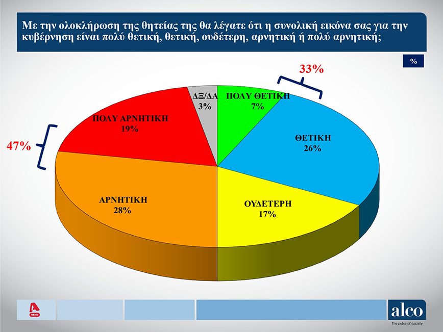 Την ίδια ώρα, το 47% απαντά αρνητικά στην αξιολόγηση της κυβέρνησης Μητσοτάκη, ενώ θετική και πολύ θετική εικόνα έχει το 33%.