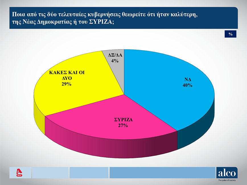 Το 40% θεωρεί καλύτερη την κυβέρνηση Μητσοτάκη, το 29% απαντά ότι ήταν κακές και οι δύο ενώ το 27% αξιολογεί ως καλύτερη την κυβέρνηση Τσίπρα.