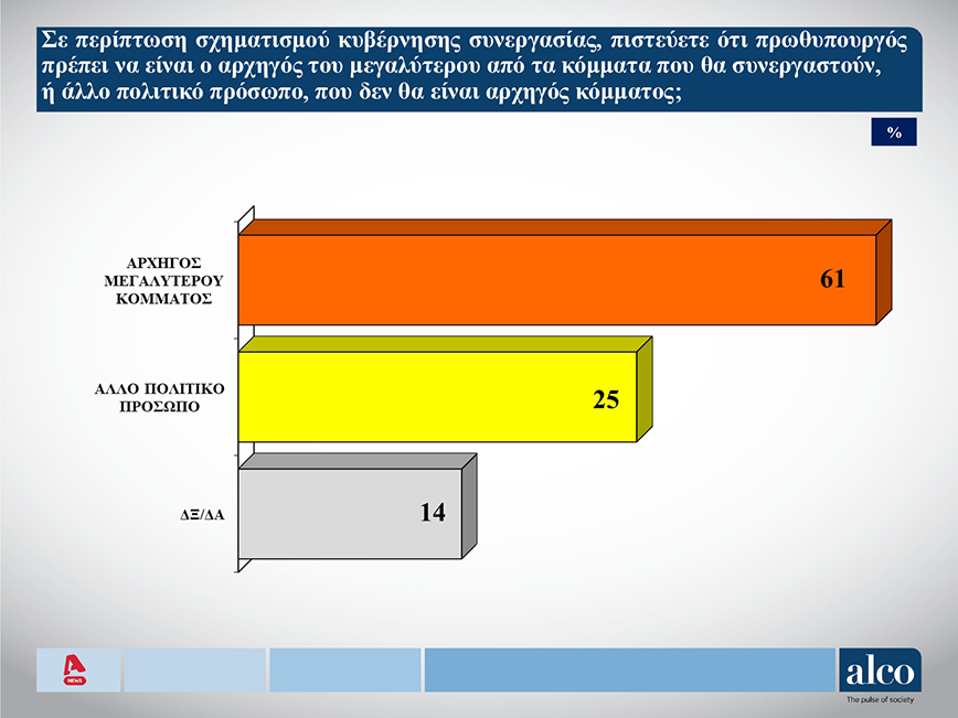 Το 61% θεωρεί ότι πρωθυπουργός πρέπει να είναι ο αρχηγός του μεγαλύτερου κόμματος, ενώ μόλις το 25% θεωρεί ότι μπορεί να είναι άλλο πολιτικό πρόσωπο.