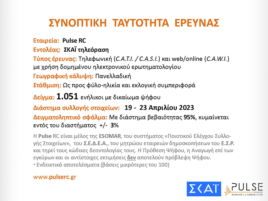 Με αναγωγή επί των εγκύρων τα ποσοστά που λαμβάνουν τα κόμματα στη δημοσκόπηση που διενεργήθηκε στο διάστημα από τις 19 έως τις 23 Απριλίου με δείγμα 1.051 συνεντεύξεις, είναι ΝΔ 32%, ΣΥΡΙΖΑ 25,5%, ΠΑΣΟΚ- Κίνημα Αλλαγής 9,5%, ΚΚΕ 6%, Ελληνική Λύση 4%, ΜεΡΑ25 5%, Εθνικό Κόμμα Ελληνες 3%.