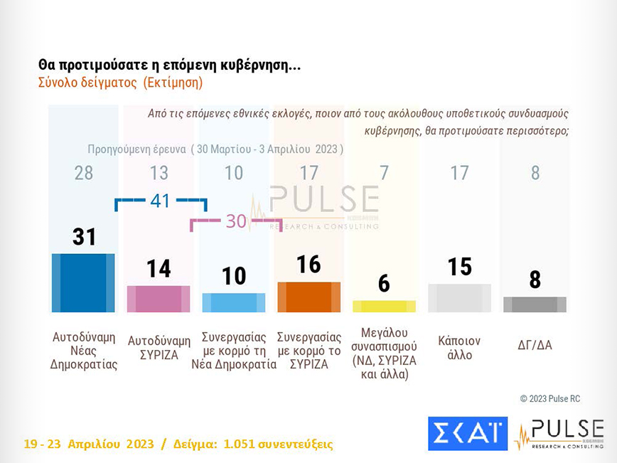 Στο ερώτημα «αν στις ερχόμενες εθνικές εκλογές δεν προκύψει αυτοδύναμη κυβέρνηση, τι θα ήταν καλύτερο να γίνει;», οι ερωτηθέντες απαντούν ως εξής: