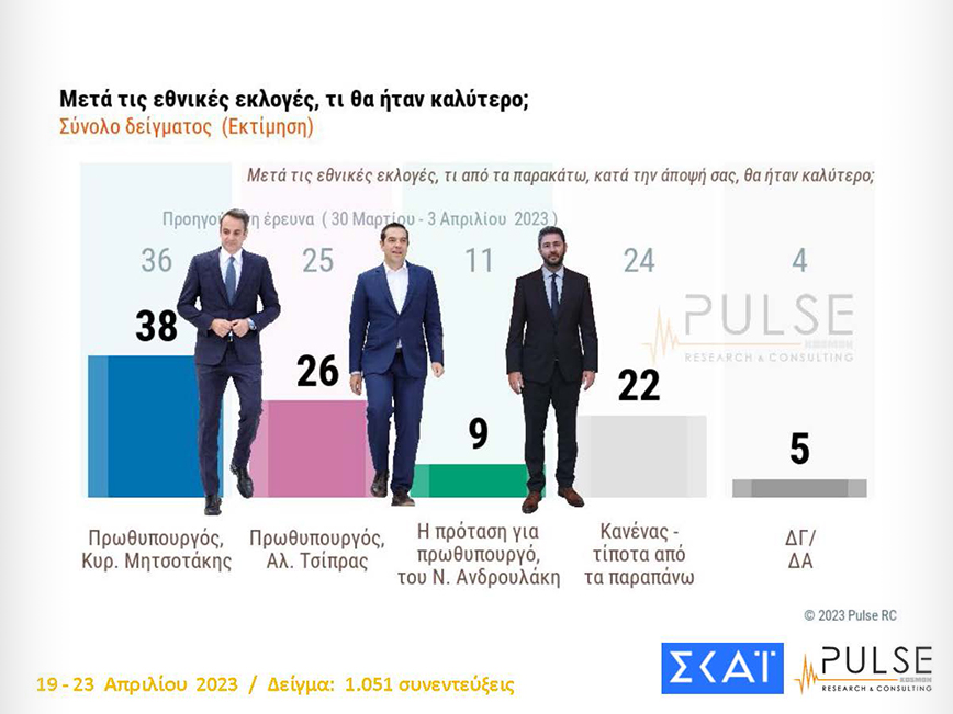 Καταλληλότερος πρωθυπουργός εμφανίζεται ο Κυριάκος Μητσοτάκης με 38%, 26% ο Αλέξης Τσίπρας, 9% ο Νίκος Ανδρουλάκης, ενώ 22% ψηφίζει κανείς.