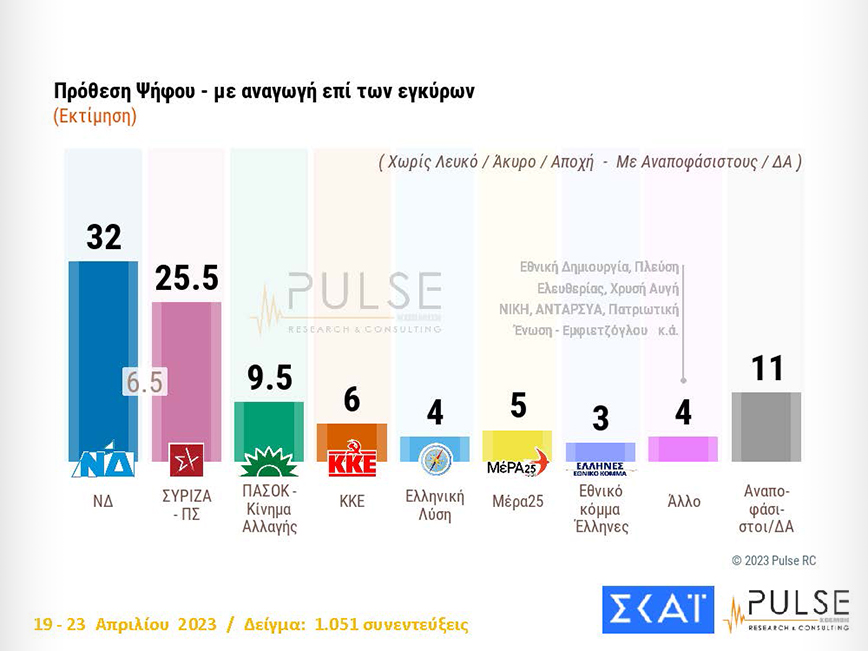 Στο 6,5% βρίσκεται η διαφορά της Νέας Δημοκρατίας από τον ΣΥΡΙΖΑ, σύμφωνα με δημοσκόπηση της Pulse για την τηλεόραση του ΣΚΑΪ.