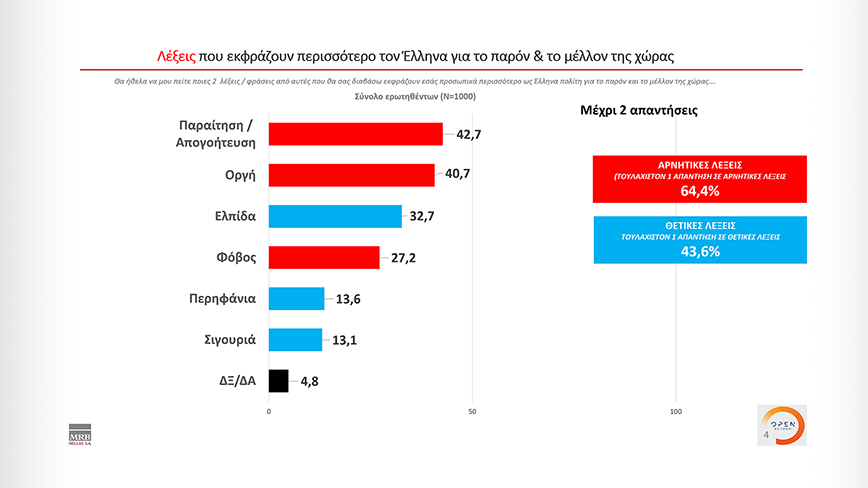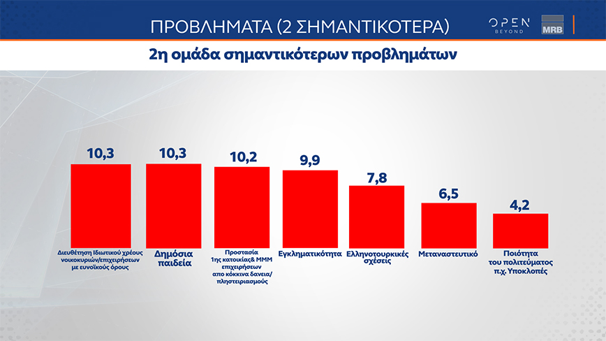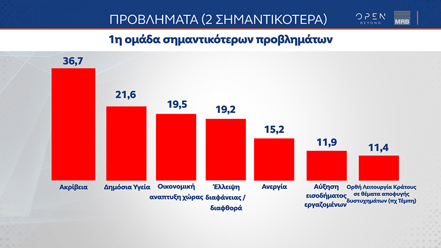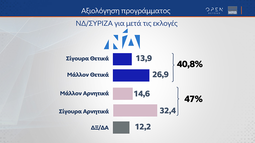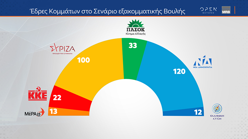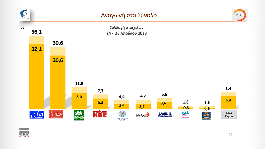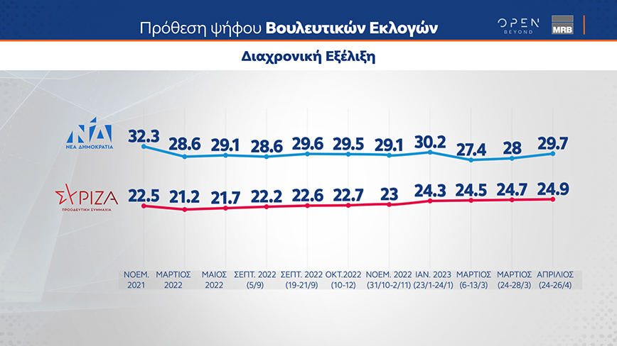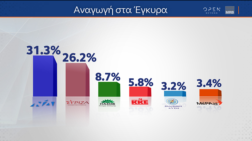 Ανοίγει η ψαλίδα ανάμεσα σε ΝΔ και ΣΥΡΙΖΑ όπως αποτυπώνεται σε δημοσκόπηση της MRB για το Open. Η διαφορά ανάμεσα στα δύο μεγάλα κόμματα ανέρχεται στις 4,8 ποσοστιαίες μονάδες και διαμορφώνεται ως εξής: