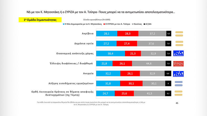 Όσον αφορά το πως απάντησαν οι πολίτες για το ποιος είναι ο καταλληλότερος πρωθυπουργός, ο Κυριάκος Μητσοτάκης έλαβε 37,4% , ο Αλέξης Τσίπρας 31,1% , ενώ κανείς λαμβάνει το 19,4%.