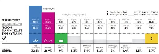 Αναλυτικότερα η ΝΔ συγκεντρώνει 32,8%, ο ΣΥΡΙΖΑ 26,9%, το ΠΑΣΟΚ-ΚΙΝΑΛ 9%, το ΚΚΕ 6,3%, η Ελληνική Λύση 3,1%, το ΜεΡΑ25 3,2%, οι Έλληνες του Ηλία Κασιδιάρη 3%, η Εθνική Δημιουργία 1,4%, άλλο κόμμα επιλέγει το 3,5% ενώ «δεν ξέρω/αναποφάσιστοι» δηλώνει το 8,7% των ερωτηθέντων.