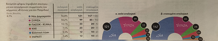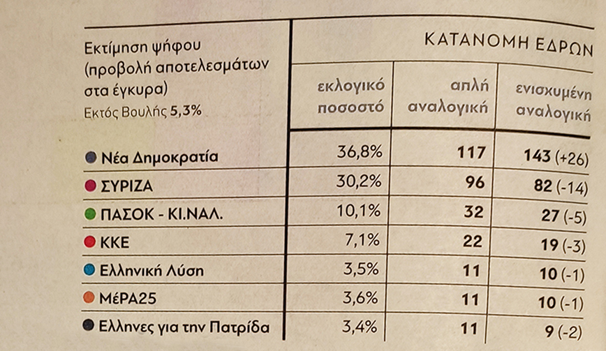 Στην εκτίμηση ψήφου επί των έγκυρων, η ΝΔ συγκεντρώνει ποσοστό 36,8%, ο ΣΥΡΙΖΑ 30,2%, το ΠΑΣΟΚ – ΚΙΝΑΛ 10,1%, το ΚΚΕ 7,1%, η Ελληνική Λύση 3,5%, το ΜέΡΑ25 3,6% και οι Έλληνες του Ηλία Κασιδιάρη 3,4%.