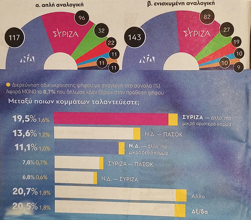 Ενδιαφέρον παρουσιάζει και η κατανομή στην αδιευκρίνιστη ψήφο. Στην ερώτηση «μεταξύ ποιων κομμάτων ταλαντεύεστε;», το 19,5% απαντάει ΣΥΡΙΖΑ ή άλλο μικρότερο Αριστερό κόμμα, το 13,6% μεταξύ ΝΔ και ΠΑΣΟΚ, το 11,1% μεταξύ ΝΔ και άλλου μικρού δεξιού κόμματος, το 7,8% μεταξύ ΣΥΡΙΖΑ και ΠΑΣΟΚ, το 6,8% μεταξύ ΝΔ και ΣΥΡΙΖΑ, το 20,7% απαντάει «άλλο», ενώ το 20,5% δηλώνει πως «δεν γνωρίζει ή δεν θέλει να απαντήσει».