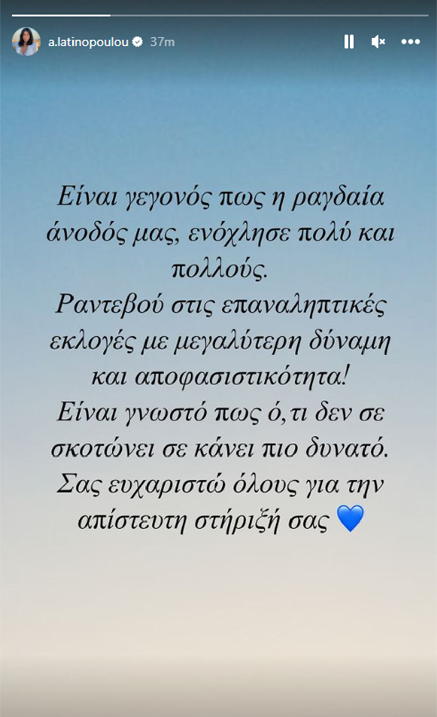Η ίδια, μέσω ανάρτησής της στον προσωπικό της λογαριασμό στο Instagram τονίζει πως «ότι δεν σε σκοτώνει σε κάνει πιο δυνατό» και δίνει ραντεβού με τους υποψήφιους ψηφοφόρους της στις επαναληπτικές εκλογές.