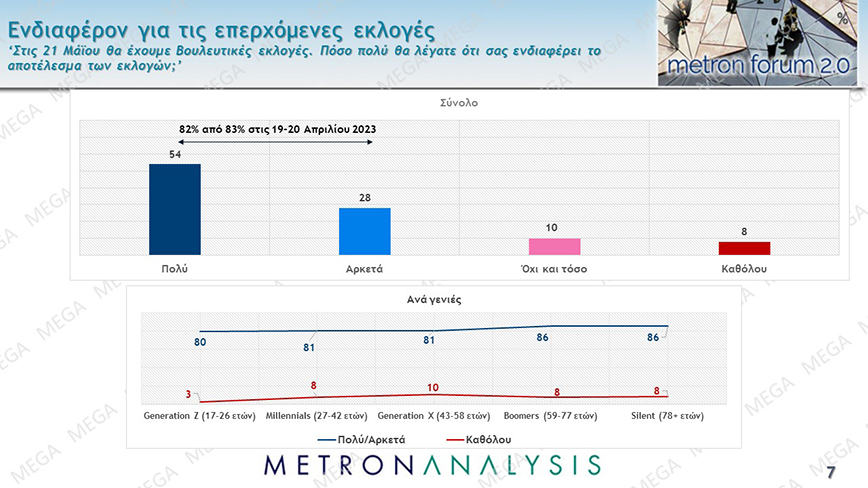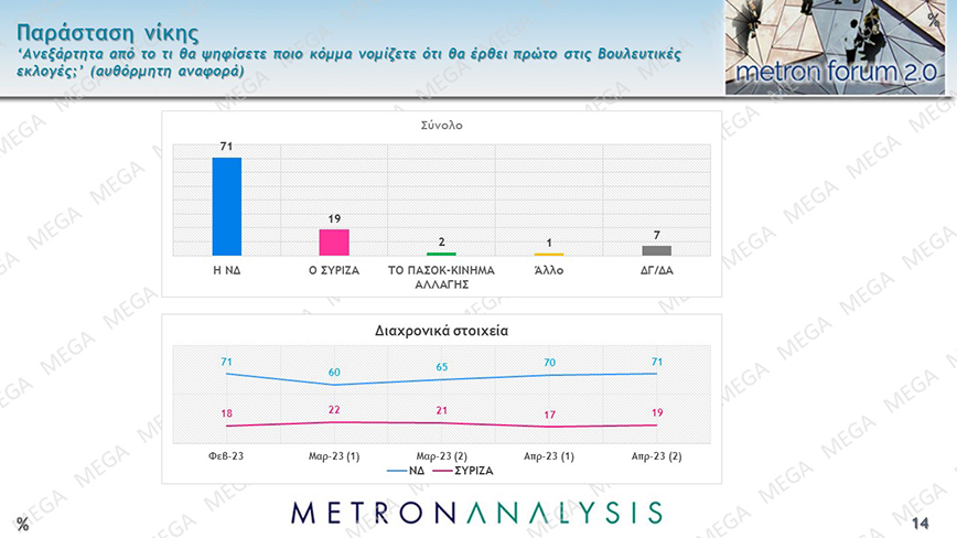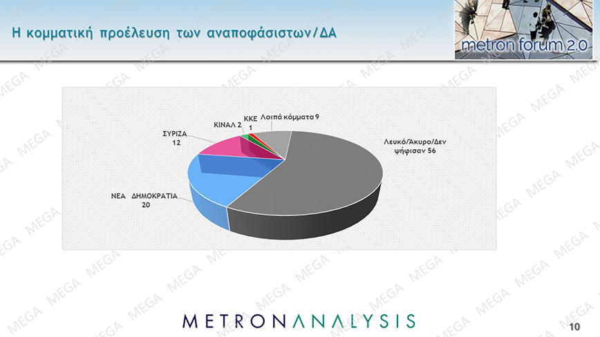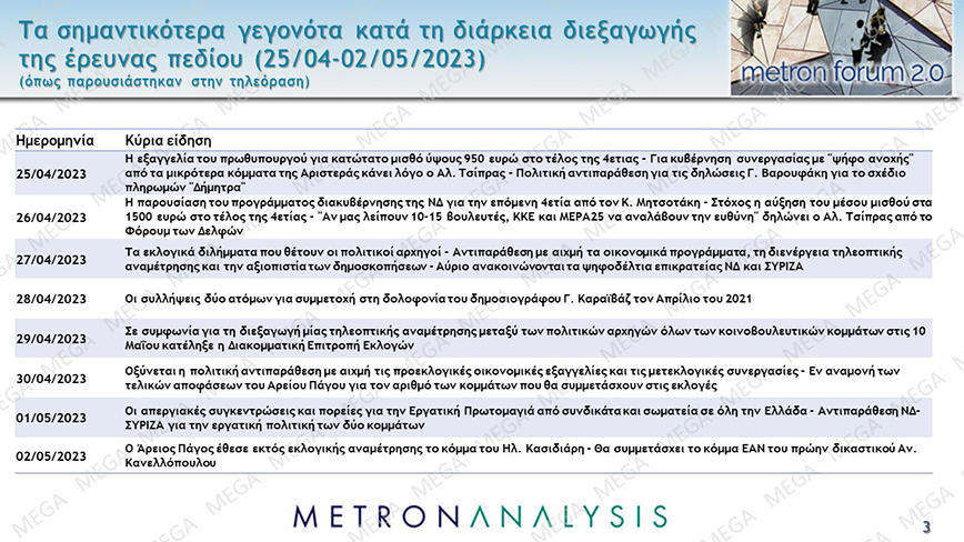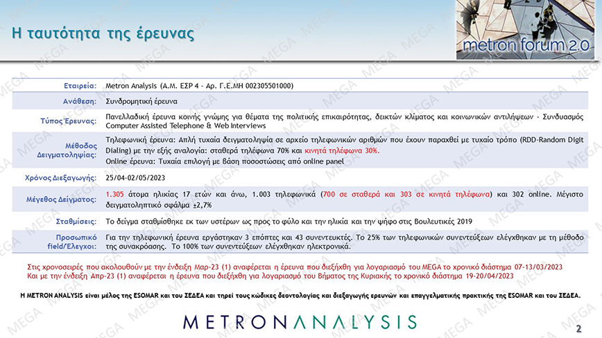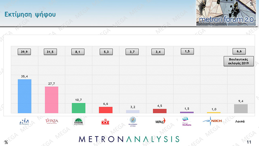Προβάδισμα 6,3% της Νέας Δημοκρατίας έναντι του ΣΥΡΙΖΑ στην πρόθεση ψήφου ενόψει των εκλογών της 21ης Μαΐου καταγράφει δημοσκόπηση της Metron Analysis για το MEGA.