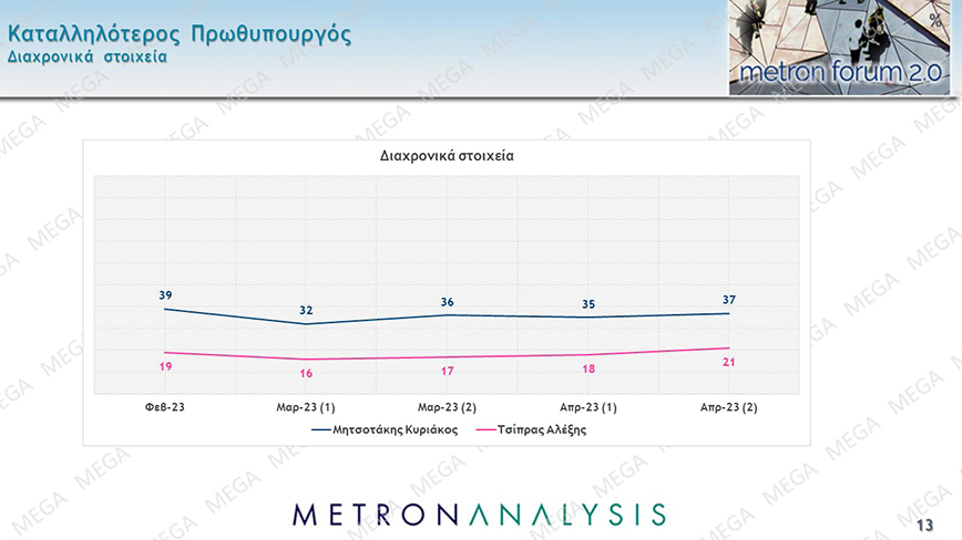 Τέλος, σε ερώτηση για το ποιος είναι ο καταλληλότερος πρωθυπουργός, το 37% προτιμά τον Κυριάκο Μητσοτάκη, ενώ το 21% προτιμά τον Αλέξη Τσίπρα.