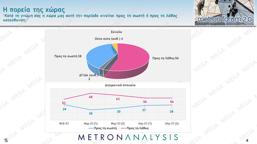 Στην ερώτηση για το πού βαδίζει η χώρα, το 56% απαντά πως πηγαίνει σε λάθος κατεύθυνση, ενώ το 38% απαντά πως η χώρα πηγαίνει στη σωστή κατεύθυνση.