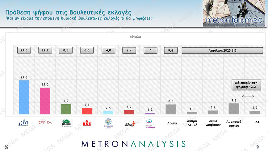 Αναλυτικότερα η ΝΔ συγκεντρώνει 29,3%, ο ΣΥΡΙΖΑ 23%, το ΠΑΣΟΚ-ΚΙΝΑΛ 8,9&, το ΚΚΕ 5,5%, η Ελληνική Λύση 2,6%, το ΜεΡΑ25 3,7%, ενώ «δεν ξέρω/αναποφάσιστοι» δηλώνει το 12,2% των ερωτηθέντων.