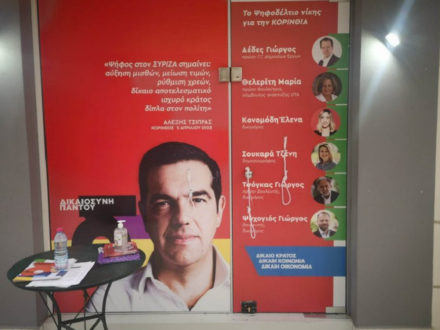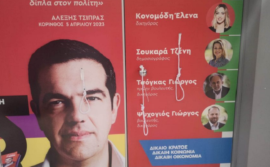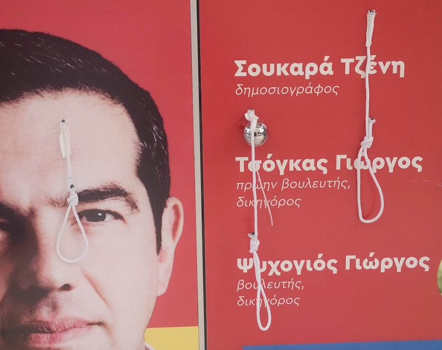 Αναστάτωση δημιουργήθηκε στην Κόρινθο, καθώς άγνωστοι τοποθέτησαν κρεμάλες στα τοπικά γραφεία που διατηρεί ο ΣΥΡΙΖΑ στην περιοχή, ενώ εκδόθηκε σχετική ανακοίνωση από τη Νομαρχιακή της αξιωματικής αντιπολίτευσης.