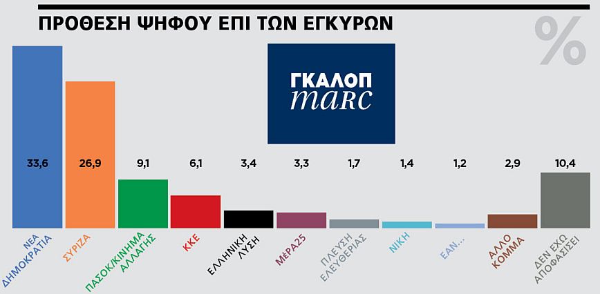 Αναφορικά με την πρόθεση ψήφου, η Νέα Δημοκρατία έχει προβάδισμα 6,7% μονάδων, συγκεντρώνοντας ποσοστό 33,6% έναντι 26,9% του ΣΥΡΙΖΑ, ενώ ακολουθούν το ΠΑΣΟΚ με 9,1%, το ΚΚΕ με 6,1%, η Ελληνική Λύση με 3,4%, το ΜεΡΑ25 με 3,3%, η Πλεύση Ελευθερίας με 1,7%, η ΝΙΚΗ με 1,4% και το ΕΑΝ με 1,2%.