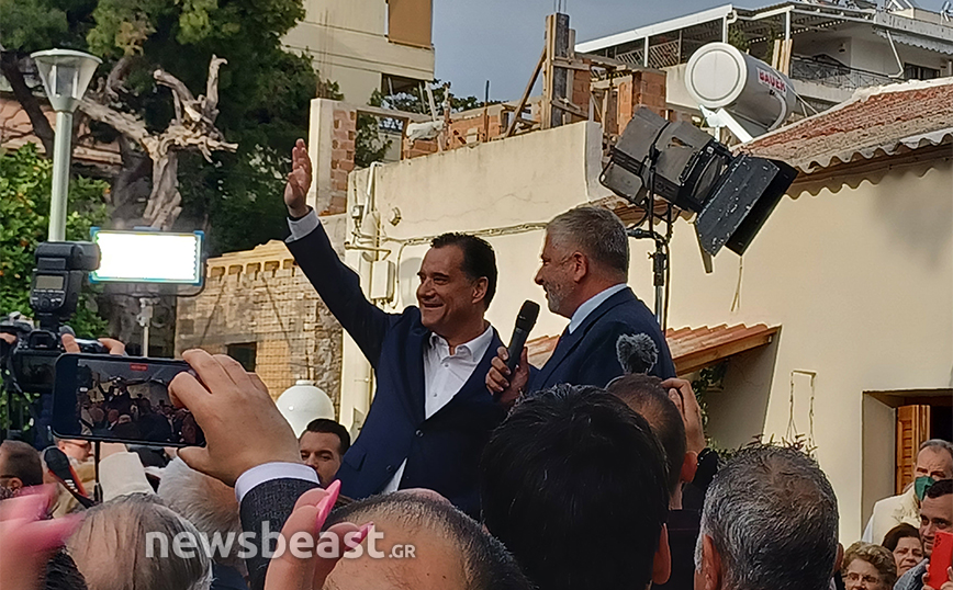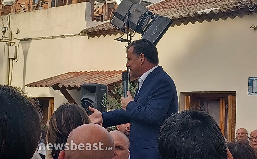 Στη συνέχεια, ο Άδωνις Γεωργιάδης ξεκίνησε την ομιλία του αναφερόμενος στη σύλληψή του δημάρχου Χειμμάρας Φρέντι Μπελέρη 48 ώρες πριν από τις εκλογές.