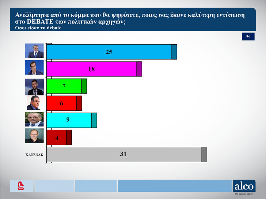 Σε ερώτημα σε όσους παρακολούθησαν το ντιμπέιτ, ποιος πολιτικός αρχηγός τους έκανε καλύτερη εντύπωση, η απάντηση «Κανένας» προηγείται με 31% και ακολουθούν, ο Κυριάκος Μητσοτάκης με 25%, ο Αλέξης Τσίπρας με 18%, ο Κυριάκος Βελόπουλος με 9%, ο Νίκος Ανδρουλάκης με 7%, ο Δημήτρης Κουτσούμπας με 6% και ο Γιάνης Βαρουφάκης με 4%.