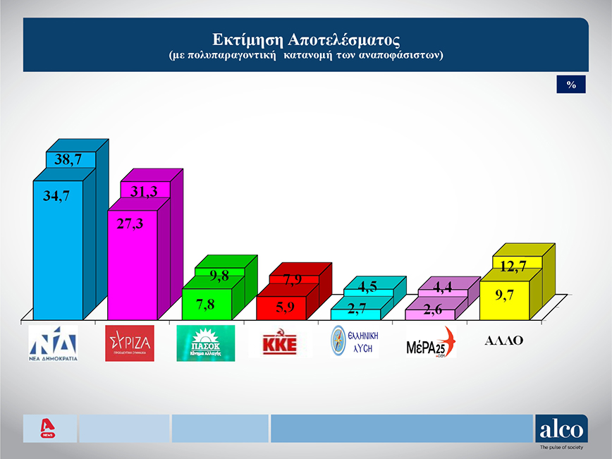 Στην εκτίμηση ψήφου της Alco, η Νέα Δημοκρατία αναμένεται να κινηθεί μεταξύ 34,7% και 38,7%. Ο ΣΥΡΙΖΑ από το 27,3% μέχρι το 31,3%. Το ΠΑΣΟΚ από το 7,8% έως το 9,8%, το ΚΚΕ από το 5,9% μέχρι το 7,9%, η Ελληνική Λύση από 2,7% μέχρι 4,5% και το ΜέΡΑ25 από το 2,6% μέχρι το 4,4%. Η ψήφος σε άλλα κόμματα εκτιμάται από 9,7% έως 12,7%.