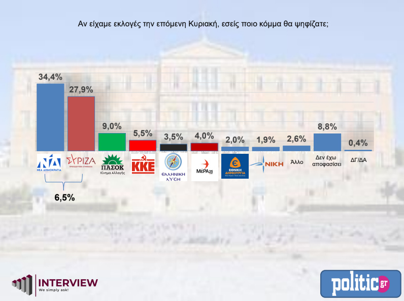 Η διαφορά Νέας Δημοκρατίας και ΣΥΡΙΖΑ είναι στο 6,5%, σύμφωνα με δημοσκόπηση της Interview που διενεργήθηκε για λογαριασμό της ιστοσελίδας politic.gr, τρεις μόλις μέρες πριν τις εκλογές 2023.