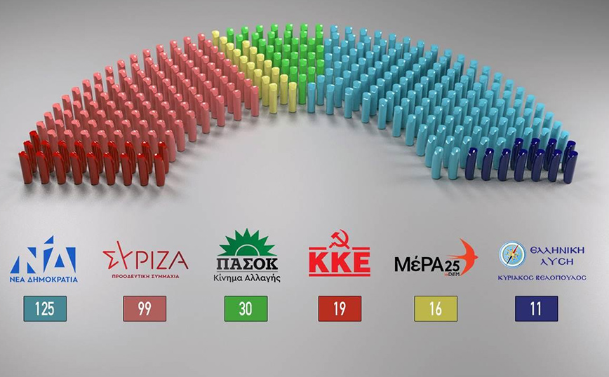Όσον αφορά την κατανομή εδρών, η ΝΔ αναμένεται να συγκεντρώσει 125, ο ΣΥΡΙΖΑ 99, το ΠΑΣΟΚ 30, το ΚΚΕ 19, το ΜέΡΑ 25 16 και η Ελληνική Λύση 11 έδρες.