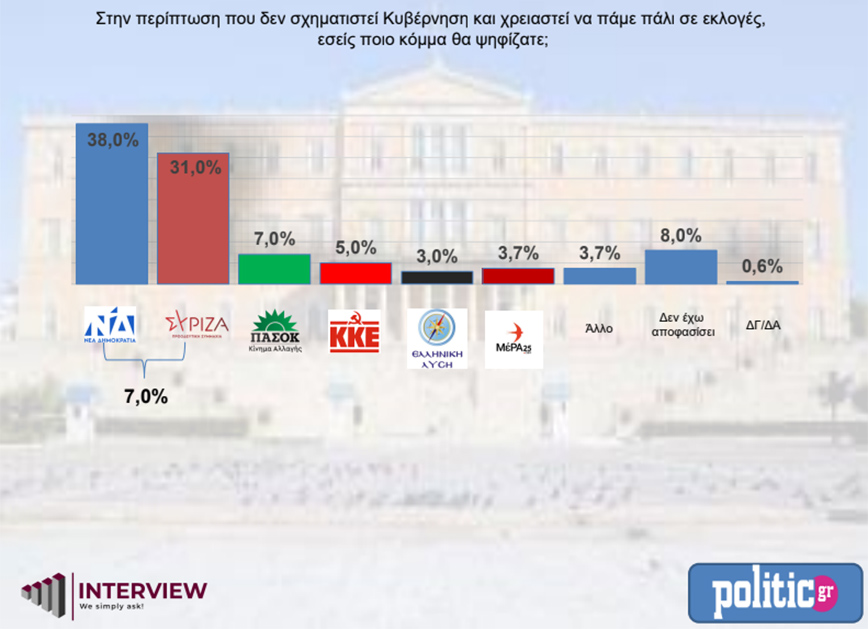 Σύμφωνα με τα στοιχεία της δημοσκόπησης, η διαφορά της Νέας Δημοκρατίας με τον ΣΥΡΙΖΑ εντοπίζεται στις 7 μονάδες, ενώ η ΝΔ με ποσοστό 38% φαίνεται να πετυχαίνει την αυτοδυναμία στις δεύτερες κάλπες.