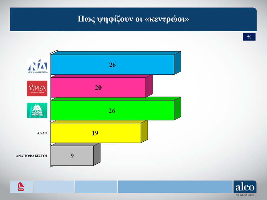 Στην ερώτηση σε ψηφοφόρους που δηλώνουν κεντρώοι τι θα ψηφίσουν στις επικείμενες εκλογές, Νέα Δημοκρατία και ΠΑΣΟΚ αναδεικνύονται ισόπαλοι με 26% ακολουθεί ο ΣΥΡΙΖΑ με 20%. Άλλο κόμμα δηλώνει το 19%, ενώ το 9% παραμένει αναποφάσιστο.