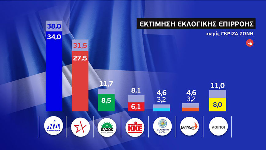 Στην εκτίμηση εκλογικής επιρροής, χωρίς τη γκρίζα ζώνη η Νέα Δημοκρατία υπολογίζεται από το 34% έως 38%, ο ΣΥΡΙΖΑ από 27,5% έως 31,5%, το ΠΑΣΟΚ από 8,5% μέχρι 11,7% το ΚΚΕ από 6,1% έως 8,1% ενώ Ελληνική Λύση και ΜέΡΑ25 υπολογίζονται από 3,2% έως 4,6%. Λοιπά κόμματα από 8% έως 11%.