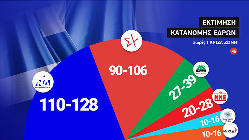 Στην εκτίμηση κατανομής των εδρών χωρίς τη γκρίζα ζώνη, η Νέα Δημοκρατία υπολογίζεται να καταλάβει από 110 έως 128 έδρες, ο ΣΥΡΙΖΑ από 90 έως 106, το ΠΑΣΟΚ από 27 έως 39 έδρες, το ΚΚΕ από 20 έως 28, το ΜέΡΑ25 από 10 έως 16 και η Ελληνική Λύση από 10 έως 16.