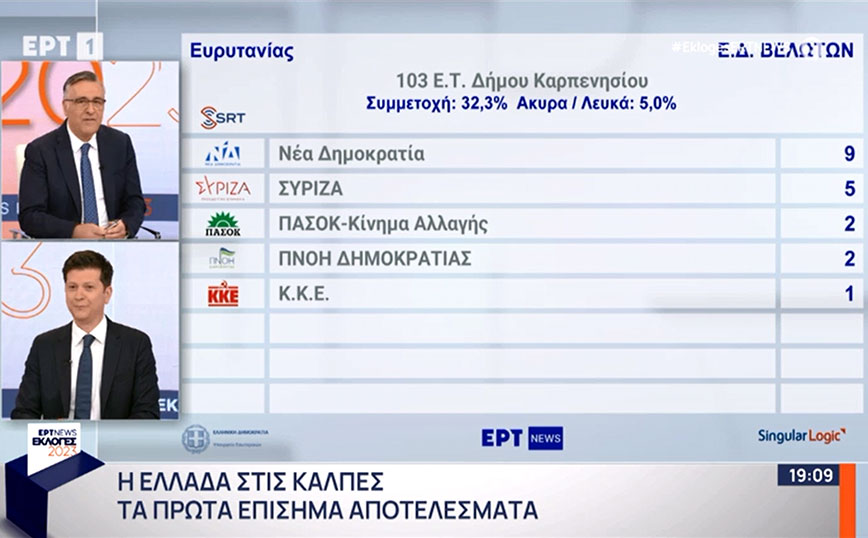 Από το Δήμο Καρπενησίου έφτασαν τα πρώτα επίσημα αποτελέσματα της εκλογικής αναμέτρησης. Πρόκειται για το αποτέλεσμα στο 103ο εκλογικό τμήμα, με συμμετοχή 32,3%.