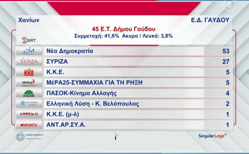 Σύμφωνα με το cretalive.gr, Νέα Δημοκρατία συντριπτικά ψήφισε η Γαύδος με 53 ψηφοδέλτια, έναντι 27 του ΣΥΡΙΖΑ.